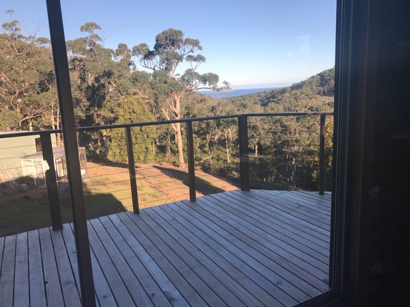 The 3-bedroom home features a large open-plan lounge/dining/kitchen area, with an extensive sun deck to take in the magnificent views. The third bedroom, laundry and bathroom are located downstairs. Lay back in your bath and watch the waves crash over Wedge Island.
