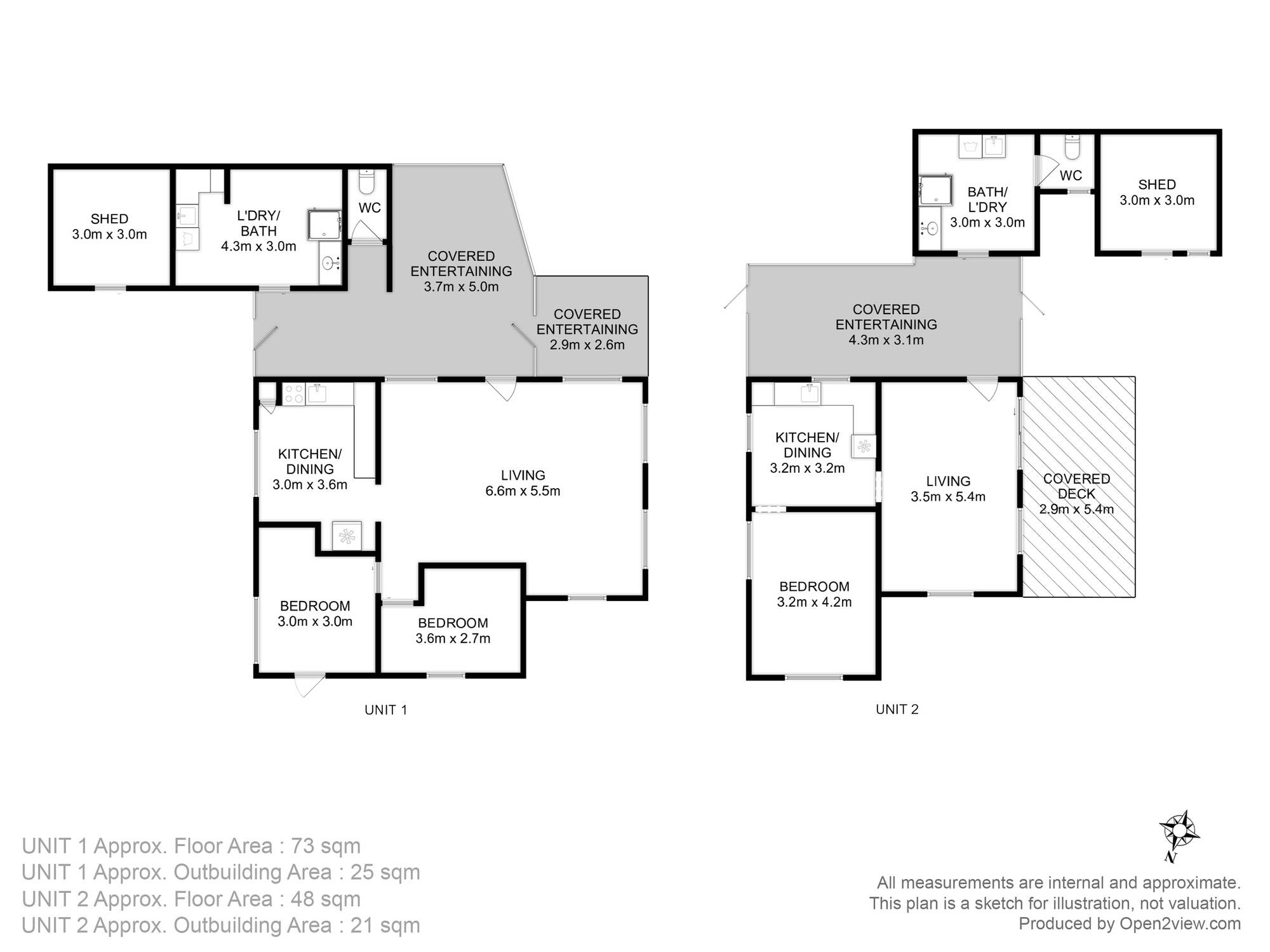 Unit 1 (Approx. 73sqm) offers a surprising sense of spaciousness, with two well-proportioned bedrooms, an open-plan living zone spanning over 6.5 metres, and a generous kitchen/dining area that flows effortlessly to dual covered entertaining zones. A detached outbuilding houses a laundry/bathroom, toilet and a 3x3m shed, all nestled within 25sqm of useful outbuilding space.